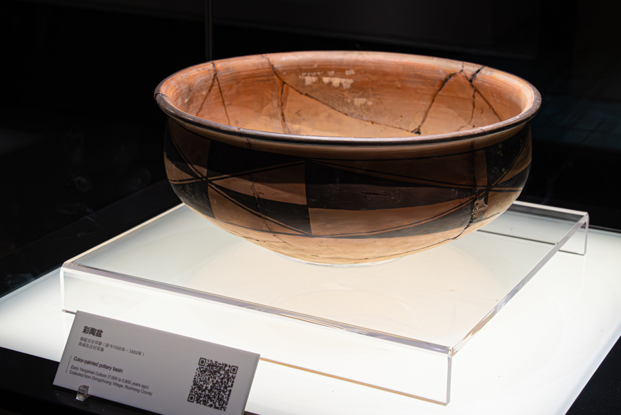 独享“单间”展柜待遇的一只彩陶盆,距今6000多年,以棕红色陶衣为底色,用黑色绘出三角形几何纹,优美流畅,随观众目光流转,甚至会产生菱形格、米字格、回旋纹等变化。它出土自芮城县东庄遗址,数千年依旧绚丽如新,成为史前艺术浪潮中的一抹亮色。
