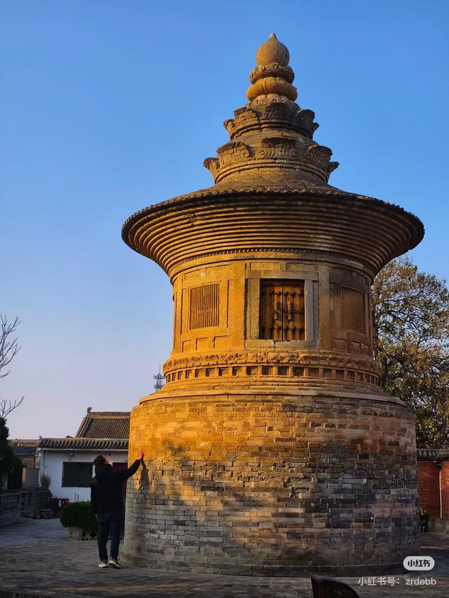 推开寺北曲村无名小路上两扇斑驳的红铁门,1200多岁的唐代泛舟禅师塔孤零零矗立在院落里。这是我国唐代圆形单层砖塔孤例,为第五批国保。基座、塔身与塔刹尽显“黄金分割”之美,顶端精雕细琢的山花、蕉叶、束带、仰莲、宝盖等装饰尤让人挪不开眼。