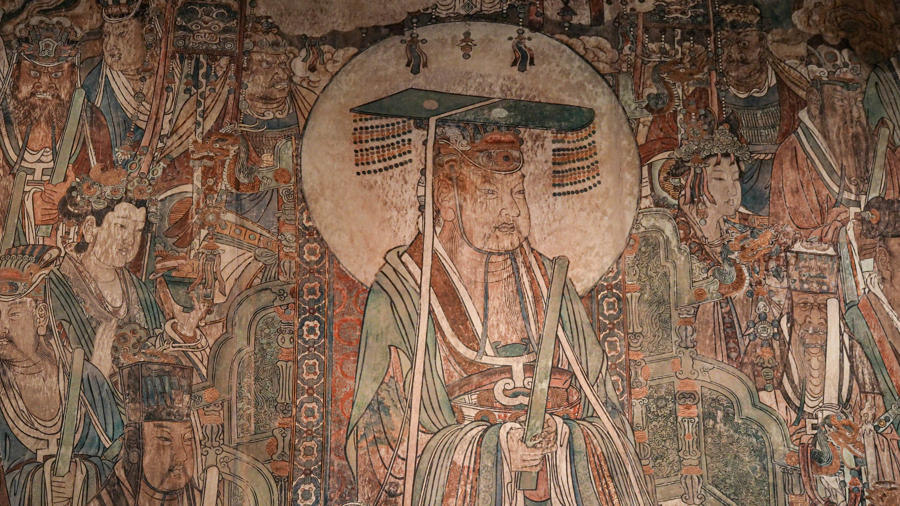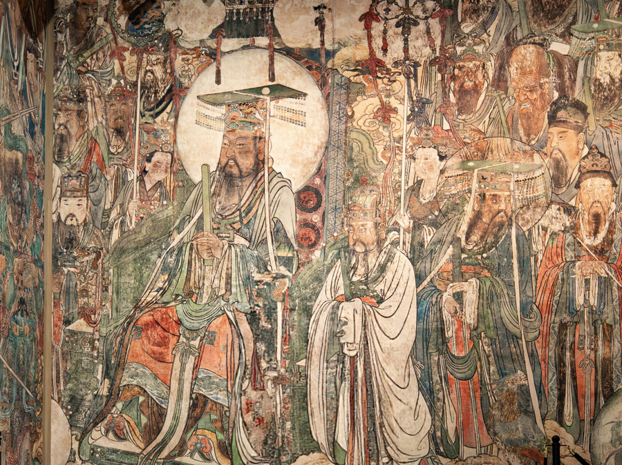 进入殿宇须换鞋套,严禁拍照。抬头仰望,与400平方米壁画舞台上各安其位的近300身神灵交换眼神,无人不惊叹。这是朝谒元始天尊的浩荡众神:八位高达三米的主神,占据队伍中心,威严庄重;前方,青龙、白虎二星君开道,后方,三十二天地君护持,周围环绕仙曹、仙官、天丁、力士、太乙、侍臣、金童、玉女、二十八宿等诸神。人物或低语交谈,或凝神沉思,或侧耳倾听,或注目凝视,个个神采奕奕,表情动作无一雷同,彼此间神态呼应,气韵贯通,形成有机而磅礴的整体。