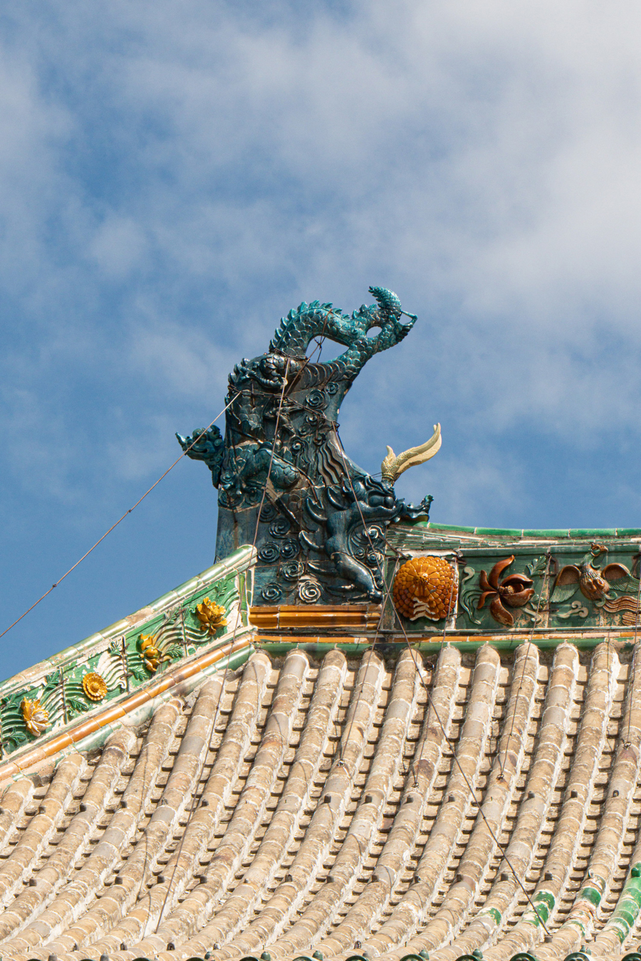 “永乐宫壁画盛名在外,其实建筑本身也有很多值得关注之处。”张青说。比如中国古代屋顶正脊两端的建筑构件——鸱吻。三清殿的孔雀蓝琉璃鸱吻构件,高达三米,颇为壮观,还见证建筑发展的承上启下——汉唐鸱吻被称作鸱尾,造型如鱼尾,到了唐末宋初,才出现龙头鱼身的鸱吻;此殿建造之前,中国建筑的屋脊上也鲜见琉璃,而以板瓦垒叠。又如建筑彩画。中国古代建筑在木构架上施有彩绘,用于装饰,亦保护木材。三清殿、纯阳殿留下大量元代官式建筑才有的“五彩遍装”建筑彩画,相当珍贵,以青绿色铺底,以赭石色、黑色、白色作画,成为元代彩画的典型实例。