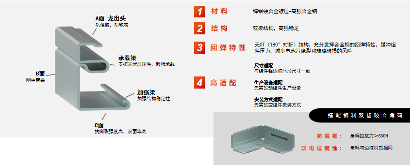 面对这一严峻挑战,中来“御风组件”通过双梁型合金钢边框实现了结构性突破。该边框采用锌铝镁合金镀层与高强合金钢基材,创造性地运用“无0T(180°对折)”结构,充分发挥钢材的回弹特性,有效缓冲组件压力。测试数据显示,其强度达到传统铝边框的3倍,抗撕裂性能提升78%,且无需改动现有组件生产设备与安装方式,实现了高适配性与高可靠性的统一。