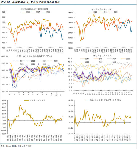 路径二:受益于美国制造业需求的外溢效应,出口的增量需求反而可能得到进一步巩固和强化,进而对国内基本面和盈利修复起到提振作用。节前披露的9月制造业PMI环比虽有回升,但国内经济修复基础尚且不够牢固,主要体现为生产强于需求,未来倘若需求出现下滑,生产可能也随之出现边际走弱的迹象。但未来可能出现的演绎路径是:美国制造业复苏与全球制造业回暖→出口订单回暖→需求修复且国内“反内卷”继续执行→价格企稳并带动企业盈利修复。事实上,从制造业PMI分项来看,外需韧性仍是当下制造业的主要支撑,体现为新出口订单和小型企业环比回升幅度较大;与此同时,高频数据显示,9月以来出口仍具备韧性。对于中国资产(A股和港股)而言,脆弱点在美元走弱下与全球资产发生高度共振的板块。两种不同场景,低位的中国顺周期资产具有最好的估值保护与潜在收益可能,受益于全球制造业周期修复的产业链条有边际上最大变化。