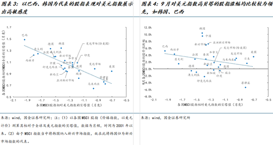 权益市场来看,受益于美联储货币宽松和“弱美元”的外溢效应,全球股市上涨且体现为“新兴市场>发达市场”,这一交易特征延续至国庆期间(仅在中间美元反弹阶段存在短暂的收敛)。即便9月底以来市场开始交易美国政府关门,但全球股市并未出现下跌,包括美股在内的全球股市整体上涨且新兴市场继续跑赢发达市场。背后逻辑在于:市场倾向于认为本次美国政府关门导致经济冲击或偏短期;与此同时,关键经济数据的“缺席”导致市场更多依赖私营部门的数据,而“小非农”数据的走软显示当下美国就业市场下行风险的上升,市场对10月底美联储采取连续降息25BP仍持乐观定价,且经济“软着陆”依然是基准情形。实际上,对全球经济周期和美元指数高度敏感(以股指对美元指数的贝塔值进行衡量)的国家/地区在9月实现更高的股价涨幅,典型的以巴西和韩国为代表的国家因获得AI扩散和有色金属矿业两大逻辑的分别加持而明显跑赢。此外,中国资产而言,内部结构的分化(超额收益更多集中于电力设备、有色以及电子等,而防御性的银行红利和消费为代表的顺周期资产并未出现明显上涨)意味着对于市场而言,本身并未做多或者做空经济基本面,只是受益于本轮全球流动性宽松的溢出效应。