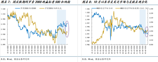 9月以来全球资产价格的表现是建立在“弱美元”的叙事逻辑之上。权益市场来看,全球股市上涨且体现为“新兴市场>发达市场”,这一交易特征延续至国庆期间。对全球经济周期和美元指数高度敏感的国家/地区在9月实现更高的股价涨幅,而韩国与巴西更获得了AI扩散与有色金属矿业两大逻辑的分别加持;与此同时,中国资产并未对自身基本面乐观或者悲观,更多是与美元走弱下的全球资产引发共振。商品市场来看,以黄金、白银为代表的贵金属成为本轮美元走弱下的最强板块,并共同跑赢以铜为代表的工业金属。而进入10月后“弱美元”的交易开始出现了一些新的线索:全球股票市场看①美股市场上罗素2000同时跑赢标普500和纳指;②发达市场(除美国)跑赢美股;商品来看,10月开始白银和铜为代表的拥有工业属性更强的品种价格上涨的弹性优于黄金。值得一提的是,尽管市场共识美元走弱的金属属性是有色金属的主要驱动,但当下以铜为代表的工业金属供需偏紧,一旦出现需求修复,反而更可能成为上涨弹性更高的品种。但值得我们思考的是,当前市场对于做空美元的共识高度一致,大部分资产都在这一逻辑下创下近期的新高,需要以“弱美元”为一切买单的假设深入人心,而最近被高度做空的美元却没有跌破前低。