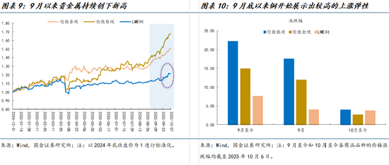 (2)商品市场来看,以黄金、白银为代表的贵金属成为本轮美元流动性盛宴下的显著受益者,9月以来两者上涨斜率陡峭化且经济“软着陆”预期下白银的上涨弹性优于黄金,并共同跑赢以铜为代表的工业金属。但如同权益市场出现新的交易特征一般,进入10月份我们同样在商品市场看到了一些变化,随着供给收缩+“软着陆”预期下需求韧性,9月底以来铜开始跑赢黄金,且国庆期间铜和白银为代表的工业属性更强的品种价格上涨的弹性均优于黄金。值得一提的是,尽管市场共识美元走弱的金属属性是有色金属的主要驱动,但当下以铜为代表的工业金属供需偏紧,一旦出现需求修复,反而更可能成为上涨弹性更高的品种。