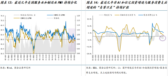 2022年开始美国经济经历了2000年以来服务业和制造业分化持续时间最长的阶段,整体呈现“服务业强、制造业弱”的“冰火两重天”的格局,这背后是财政主导的因素带来了美国本轮周期的最大分歧。数据显示,自从2022年11月以来美国制造业PMI向下突破50荣枯线之后,高利率环境使得美国制造业PMI至今尚未向上实现有效突破荣枯线;反观服务业PMI,受益于薪资增长多数时间内均处于荣枯线之上,这也成为美国经济韧性的主要来源。事实上,拆分美国GDP分项来看,尽管服务消费支出增速有所回落,但实际上仍明显高于剔除AI和住宅后的投资增速,且两者之间的“负剪刀差”(非AI和住宅投资增速-服务消费支出增速)仍在低位。而当下美国服务业和制造业的分化也使得未来两者不同的演绎路径可能导致美国经济可能走向不同的方向,或将成为未来美元指数走弱的逆风因素。对于投资者而言,更为重要的是在美元做空预期一致的情形下关注“弱美元”交易叙事出现转变的可能性。